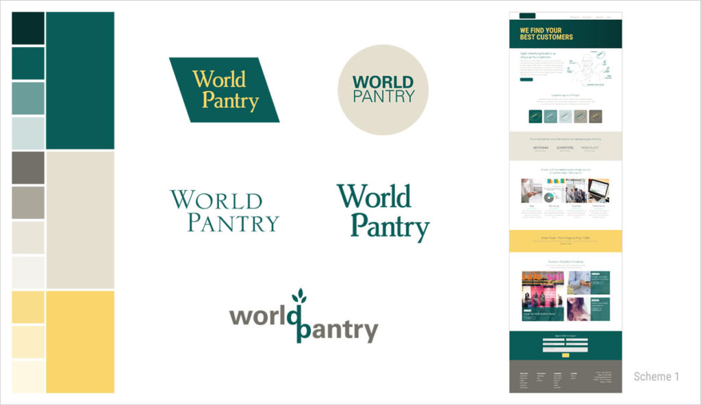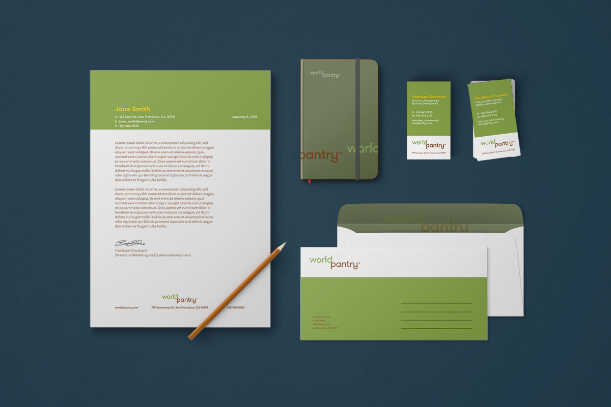 The logo is a basic word mark that provides recognition in the short term and has logomark potential for future phases. GT Walsheim font by Grilli Type provided the friendly, approachable letterforms that communicate the “optimistic, joyful, warm and passionate” aspects of the brand that the stakeholders value, as well as the evenly distributed weight and balance reminiscent of an “experienced, dependable, solid and honest” Organization. Lining up the “d” of World and “p” of Pantry can be indicative of a sprig sprouting leaves, creating the potential for a mark to be developed in a later phase. The budding twig could be used to represent the growth opportunity that the company provides its partners and employees, as well as the support and tools necessary to cultivate that growth.